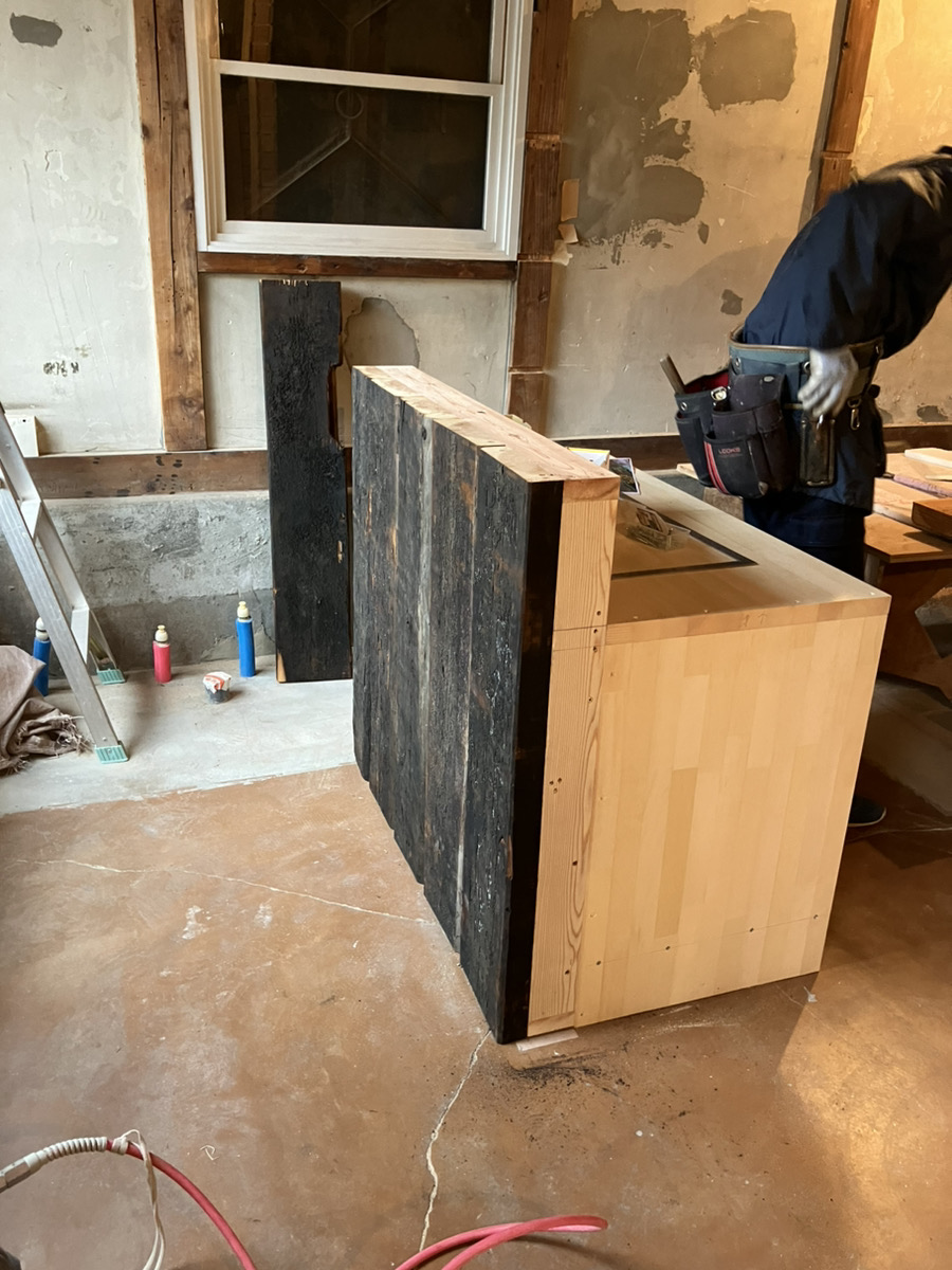 ↑古材を貼り合わせたカウンターを作成中です!