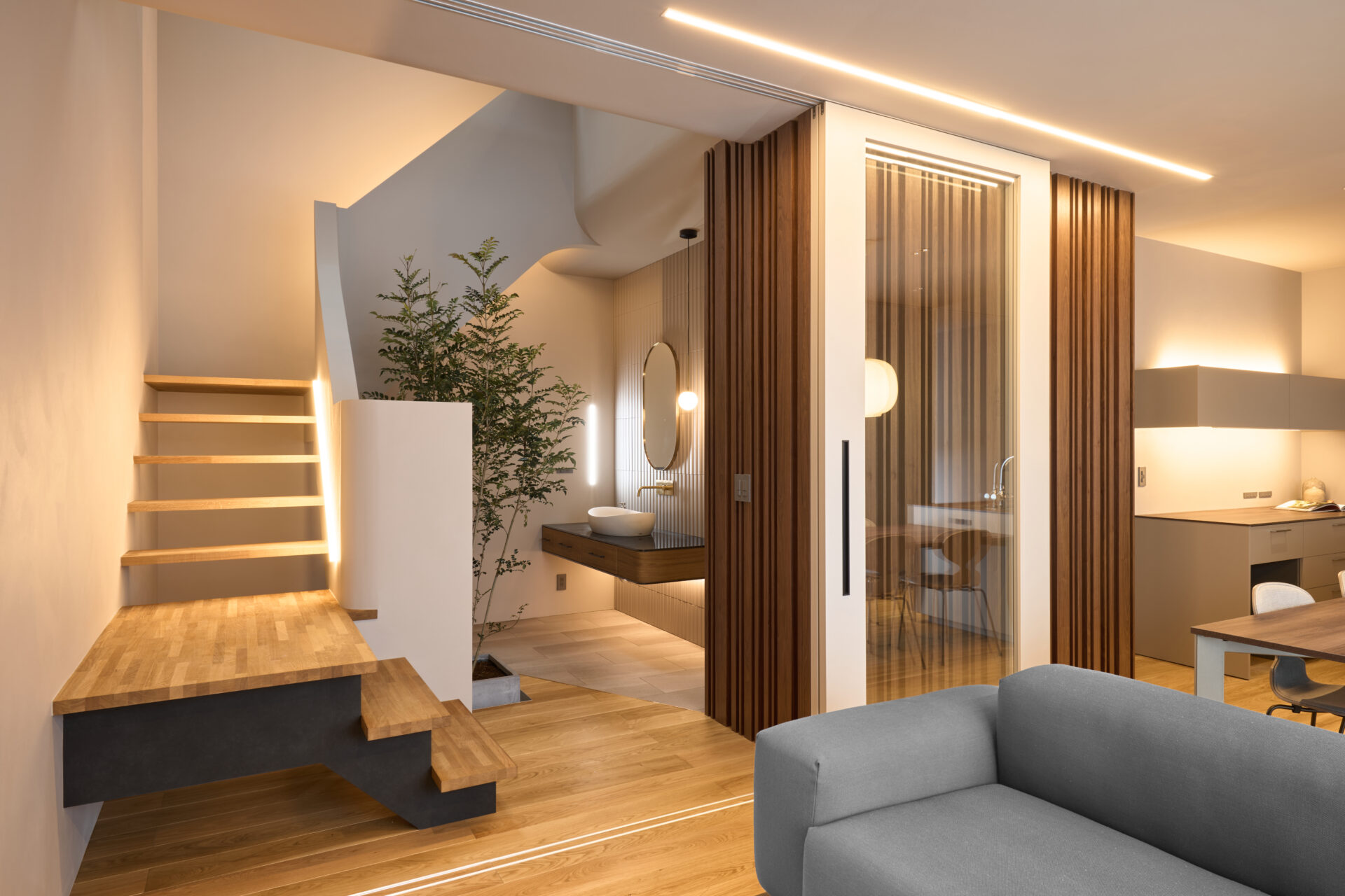 吹抜けとシンボルツリーを中心に広がる階段は、生活空間と水回りを綺麗につなげます。