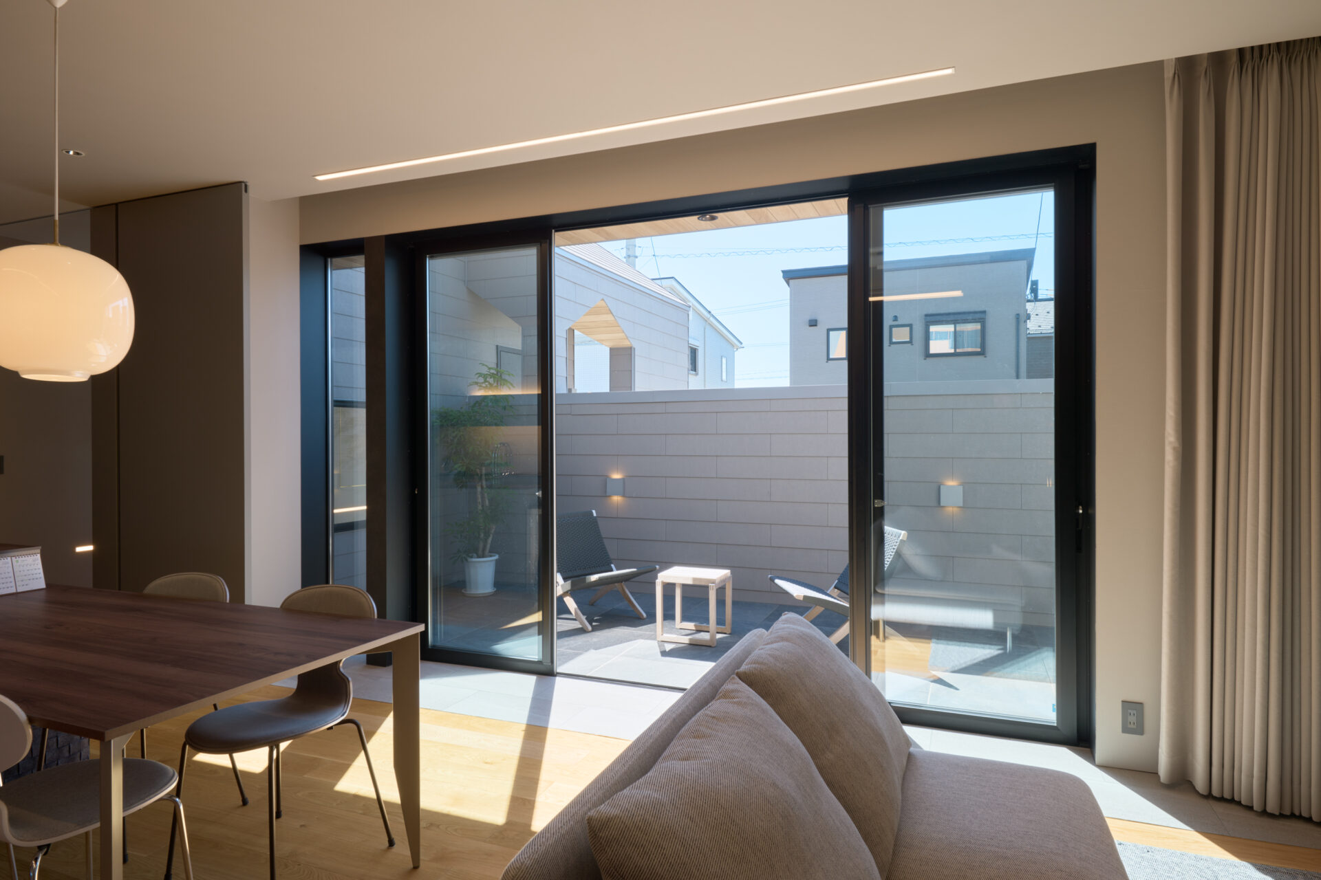 住宅地でもプライバシーを確保し、大開口を設けて外空間を楽しめます。