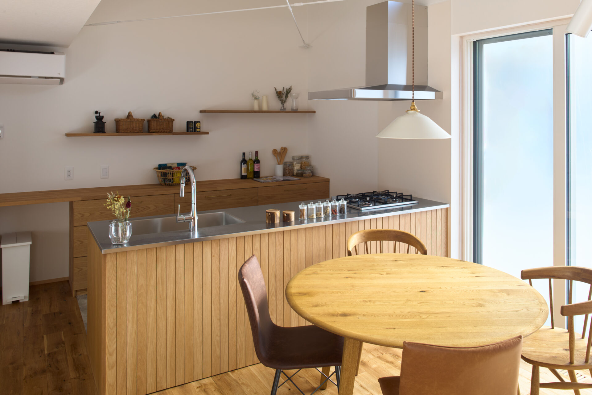 キッチンには造作のパネリング(連続して張る木材パネル)を施し、