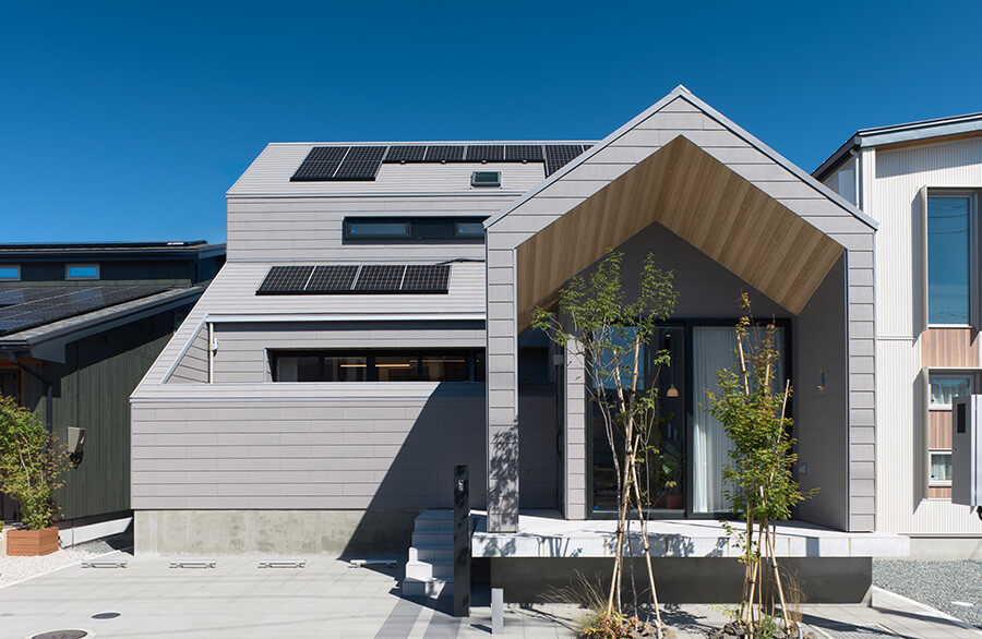 外観はシンボリックな三角屋根が印象的なファサード。軒を深くとらず、塊としての造形美を意識したデザインは、道行く人の目に「暮らしの気配」がふと感じられるように工夫しています。