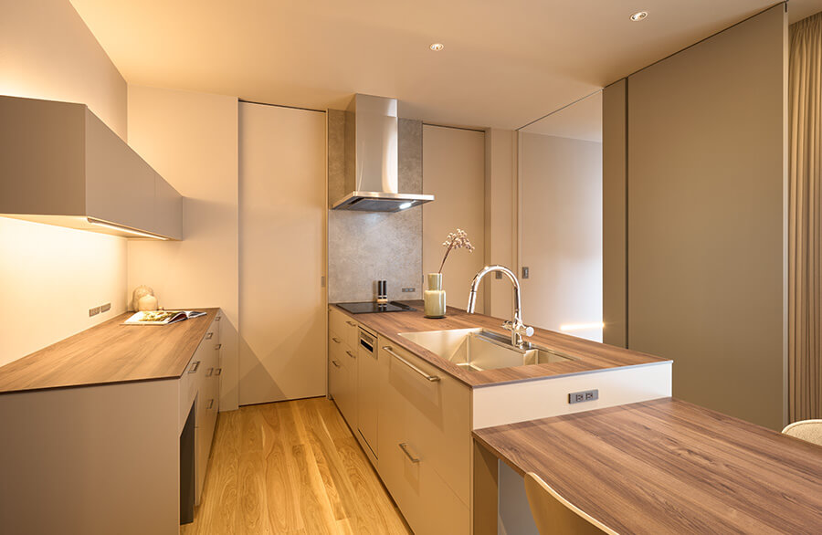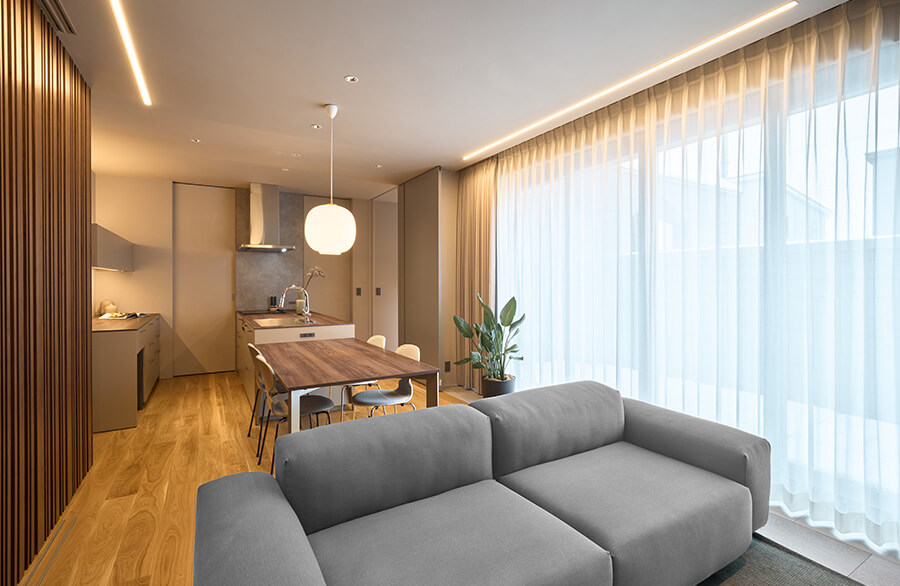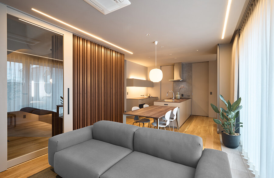 開いた空間と、閉じた空間 スライド式の扉を開閉することで、LDKと洗面スペースを仕切ることができ、急な来客時も安心。忙しい時間帯は扉を開けて空間をつなげ、静かに過ごしたいときは閉めて落ち着いた雰囲気に。時間帯や目的に合わせ、LDKの広さや印象を自在に変えられます。
