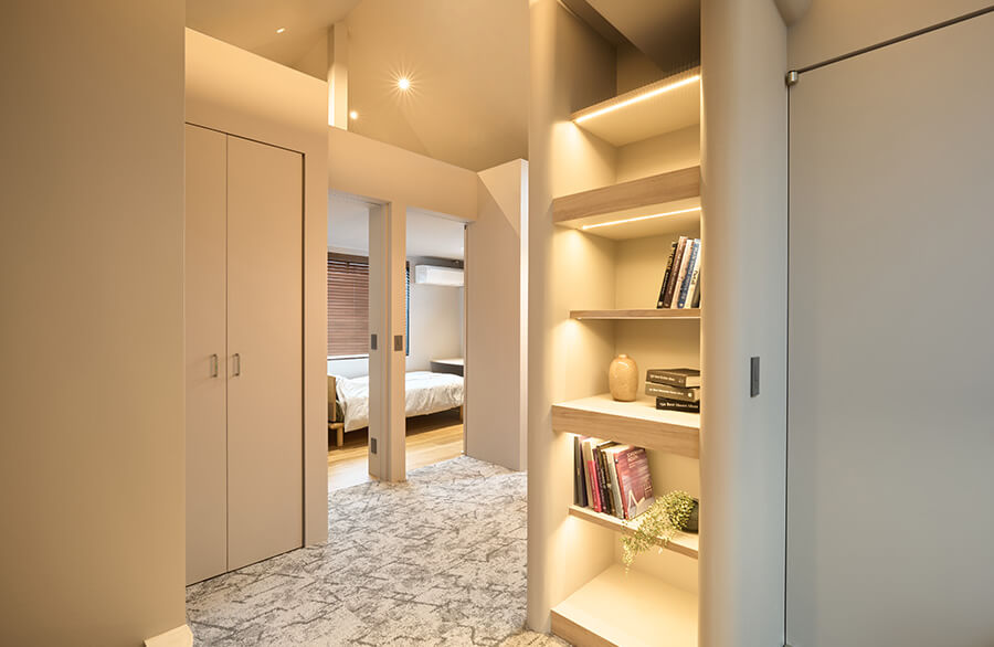 セカンドリビングとしても使える2階 2階は家族だけが過ごすプライベート空間。子ども部屋や主寝室のほか、ファミリークローゼットや本棚も。各部屋は書斎やセカンドリビングとして使え、ホールの本棚は家族の図書室に。学びや仕事に集中できる、家族それぞれに心地よい環境を整えました。